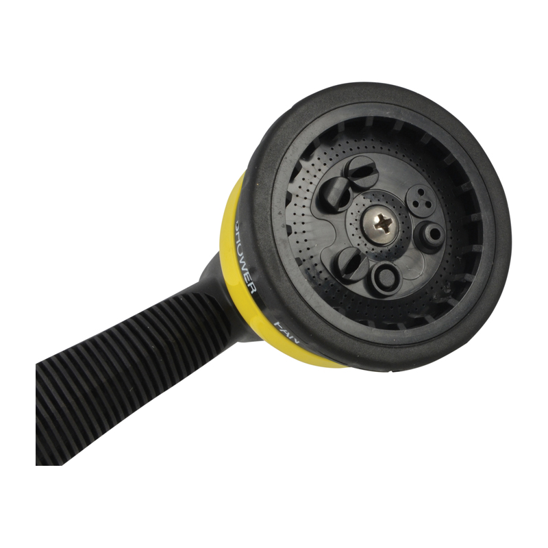 Nine-pattern garden spray gun with a comfort grip handle and a brass male connector.